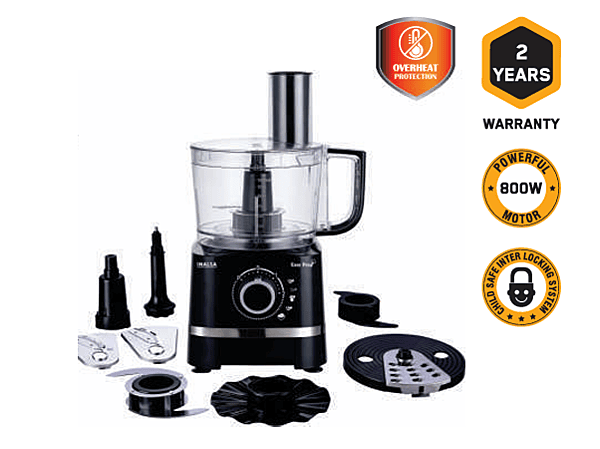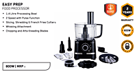 The Inalsa Easy Prep Food Processor is a compact yet powerful kitchen companion designed for everyday cooking needs. With an 800W motor and a 1.4-litre processing bowl, it handles chopping, slicing, shredding, kneading, and whisking effortlessly. Equipped with Quadra Flow technology and a twist & lock safety mechanism, it ensures smooth operation and user safety. The processor includes multiple attachments such as slicing, shredding, and French fries cutters, along with chopping and atta kneading blades. Overheat protection and a child-safe interlocking system add reliability and peace of mind. Ideal for Indian kitchens, it simplifies food prep while saving time.