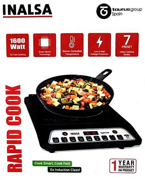INALSA Rapid Cook is a modern, high‑performance induction cooktop designed for fast, safe, and energy‑efficient cooking. Powered by a strong 1600W heating system, it ensures quick heat-up and consistent cooking results. Its Smart Sense Technology automatically adjusts temperature and power based on the cookware, while the 7 preset Indian cooking menus make everyday cooking effortless. The cooktop features a 4‑digit digital display, programmable timer, and multiple safety protections including low/high voltage protection and auto power-saving mode. With anti-skid feet and a sleek black finish, it is perfect for every modern kitchen.
