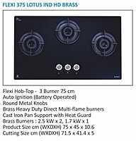 Elica Flexi 375 Lotus IND HD Brass is a stylish and high‑performance 3‑burner hob‑top designed for modern Indian kitchens. It features heavy‑duty brass multi‑flame burners, battery‑operated auto ignition, and cast‑iron pan supports with heat guard for maximum durability and convenience.